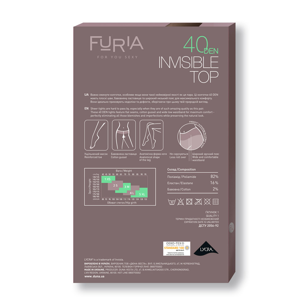 Колготки женские FURIA INVISIBLE TOP с заниженной талией , 40 DEN DUNA 1213
