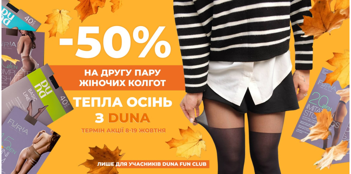Не мерзни й не нудьгуй цієї осені. З 8 по 19 жовтня діє спеціальна пропозиція: –50% на другу одиницю з асортименту жіночих поліамідних або бавовняних колгот DUNA та FURIA.