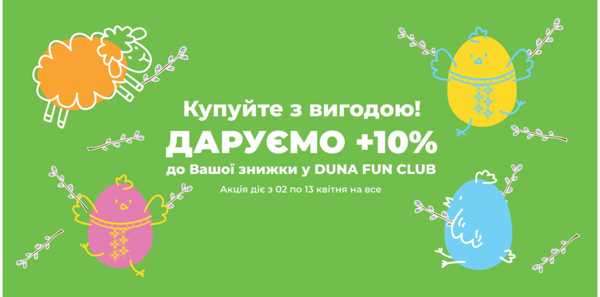 З 2 по 13 квітня лише для учасників DUNA FUN CLUB даруємо +10% до вашої дисконтної знижки на все.