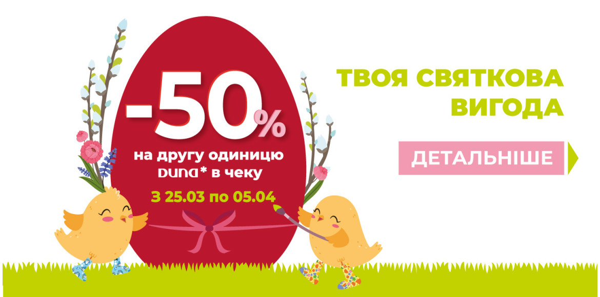 Великодній кошик вигод від DUNA! З 25.03 до 05.04 купуйте дві одиниці асортименту DUNA та отримайте -50% на другу, дешеву річ у чеку.