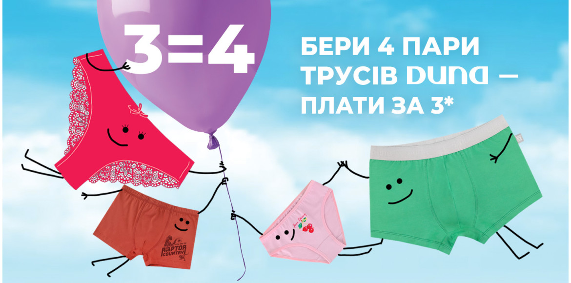 Купуй 4 пари білизни DUNA для жінок, чоловіків і дітей, а плати лише за 3